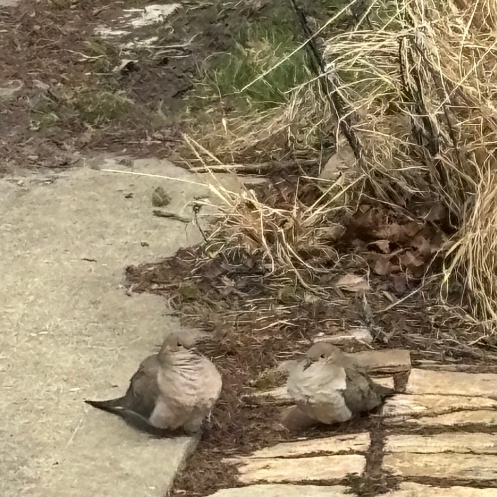 there is something infinitely reassuring when a pair of mourning doves chooses your yard. these two sweet doves spend lots of time either in our yard or peripheral to it – in the trees, on the wires, on the neighbor’s roof overlooking our backyard – all directly related to whether dogga is in or out.