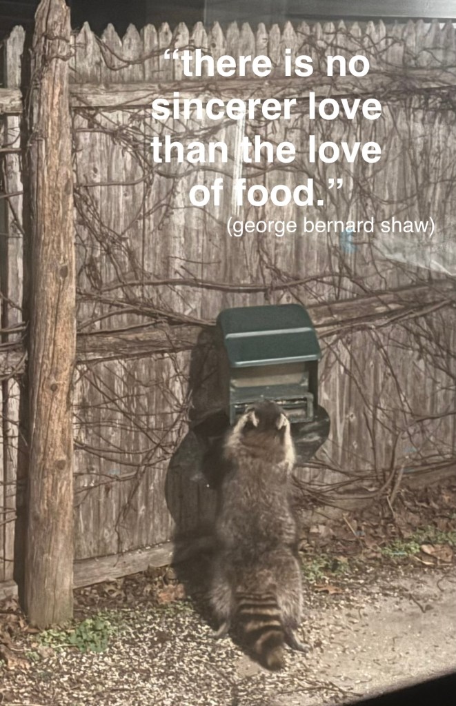 i’m not sure what else raccoons do in the world – other than eat. though I’m guessing he may think the same about all of us. what we don’t know we don’t know.