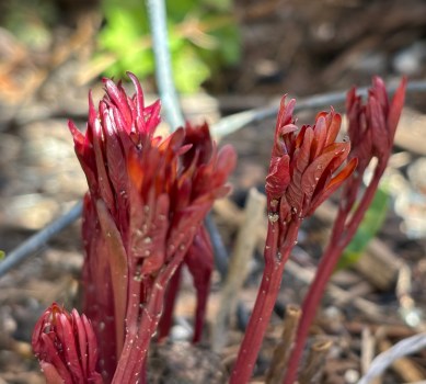 in what feels like a moment of gardener glory, i suddenly noticed that the peonies are rising. because they are sooo utterly gorgeous, it always feels like great success when they return, when nothing i have done or not done has dissuaded them from coming back. these reddish-maroonish sprouts – full of promise – are growing and, one day down the road, on a warm late spring or early summer day full of sunshine, we will have stunning peonies again. beauty is on its way.