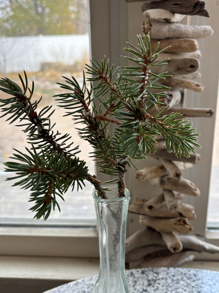 bundled up in down vests and gloves, we were finished the cleaning-up of the backyard, readying it for winter. though we are reluctant to face the winter, it feels good to tuck away the adirondacks and the gravity chairs, the rugs made of recycled plastic straws, the firepit and the little wrought iron glass table. as i cleared leaves off the deck to make it easier for my wonderful husband to shovel future snows, i stumbled across this bit of evergreen. fallen from our spruce tree, it reminded me immediately of the little tree we – years ago – had brought home from aspen: “ditch”, named after our favorite trail there, a profoundly emotional place for us.