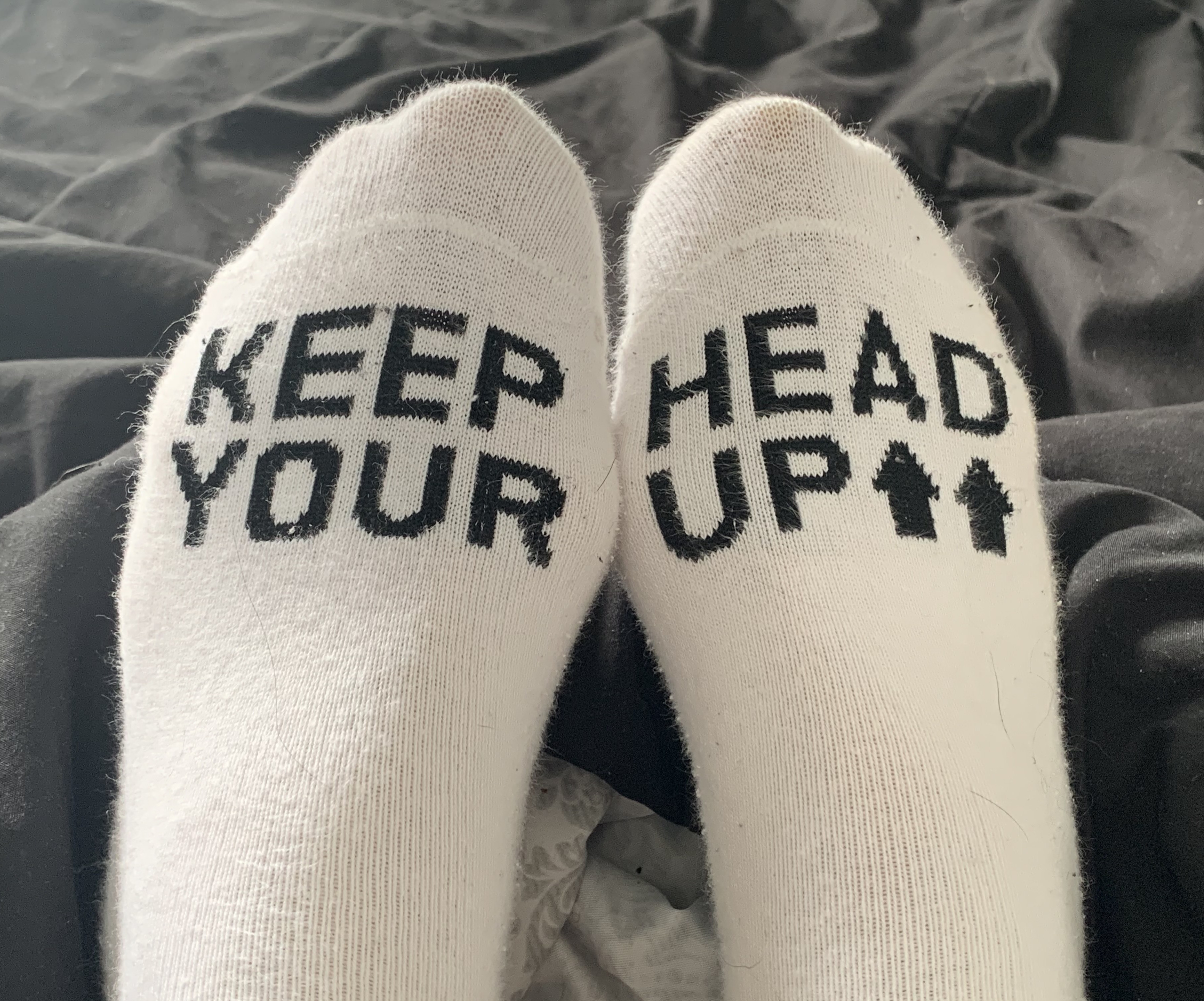 the socks came packaged with soup mix and a ladle we use every single time we serve soup. “keep your head up ⬆⬆” was good advice. it still is. and every time i wear these – mostly as sleepynightnight socks to avoid dreaded leg and foot cramps – i think of margaret and ruth, who sent them to me.