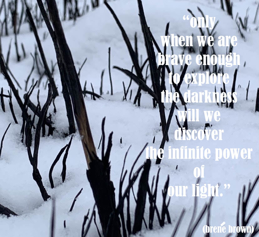 and suddenly there were tears in my eyes. i could feel the fire and the scorched-ness, the cooling snow blanketing it all, the energy still there – underground. i could feel the tenacity of these stalks and twigs, having survived the storm of the planned fire, ready for rejuvenation, resurgence. scrappy and resilient, potent, sturdy – the light past the dark. the recovery post-fire, post-exploration, a renewal. i could feel their passage through it.