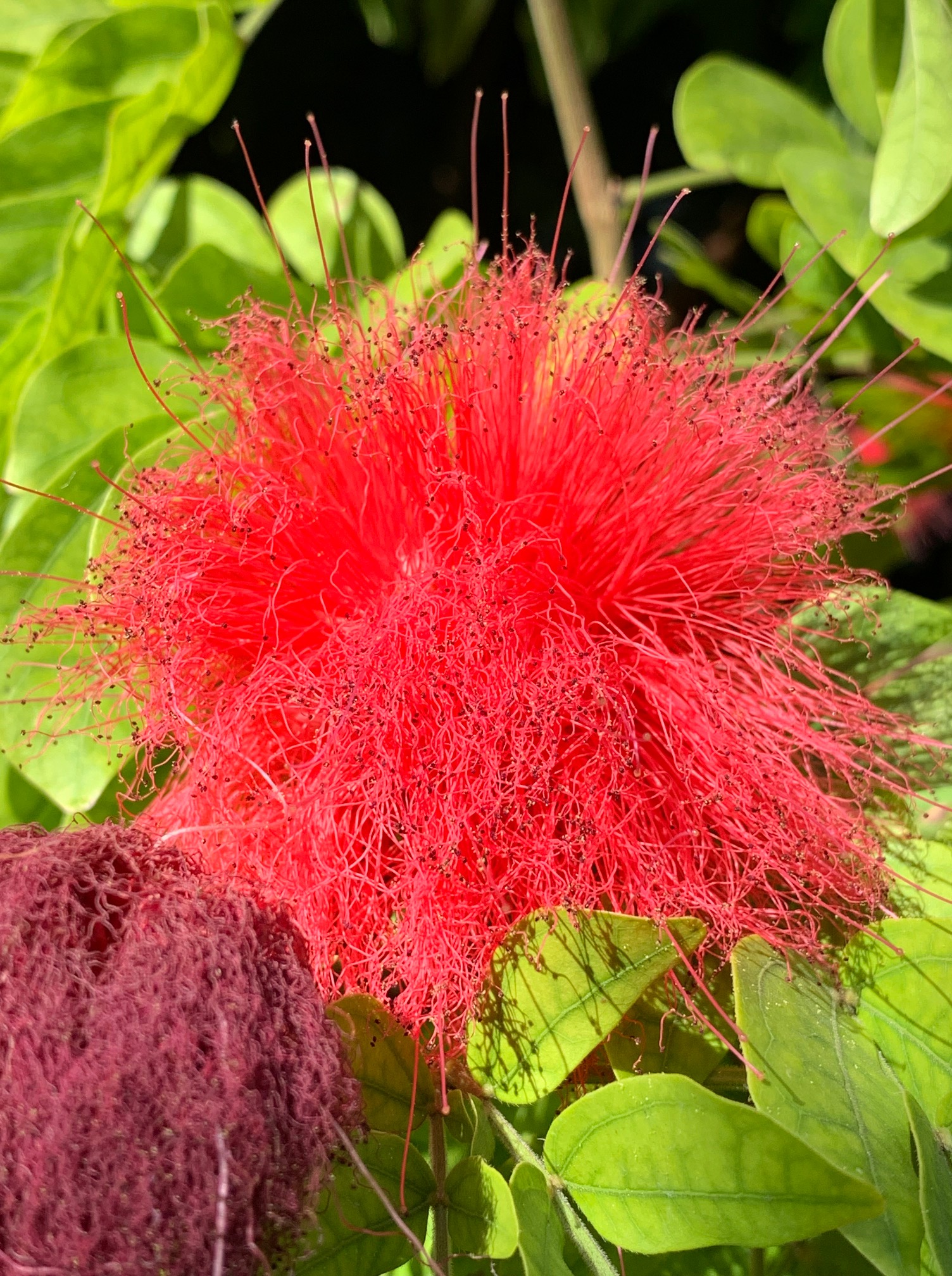 the pink bloom stopped me in the middle of the botanic garden greenhouse. it wasn’t a duplicate of our mimosa; it may not even have been a mimosa. but the pompom shape and the blossom echoed our tree’s blooms and, instantly, i was taken back home.