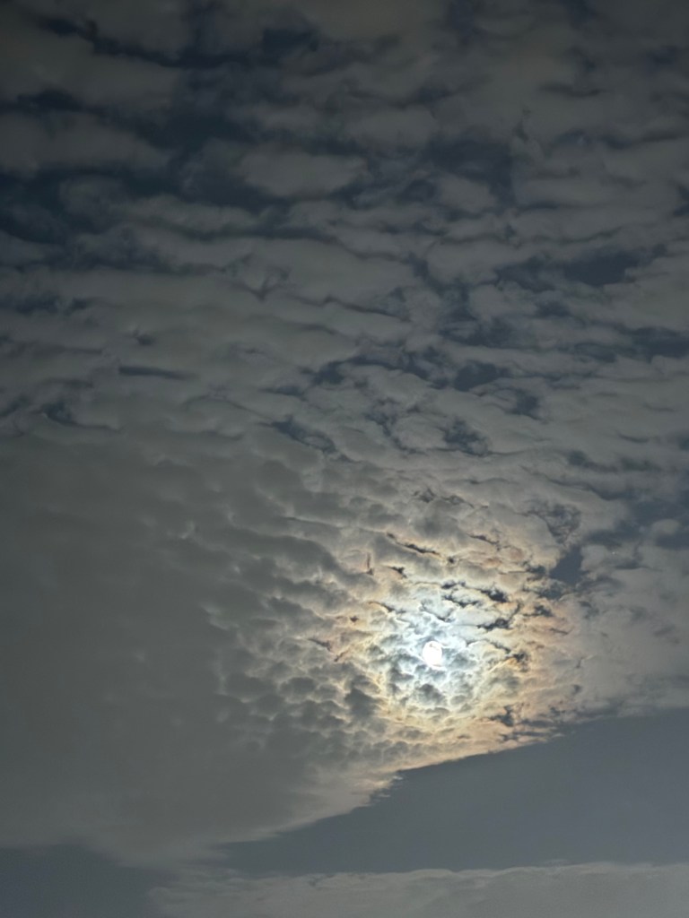 the clouds and the moon got together, plotting a bit of choreography. nearly full, this waxing gibbous was extraordinarily bright, backlighting the cotton balls of clouds passing in front of it. with wildfire smoke particles catching the light, an orange glow encircled the white moon peeking out, the glow much like the salt lamp emits in my studio. we stood on the platform, waiting for the train, completely captivated by the sky above us.