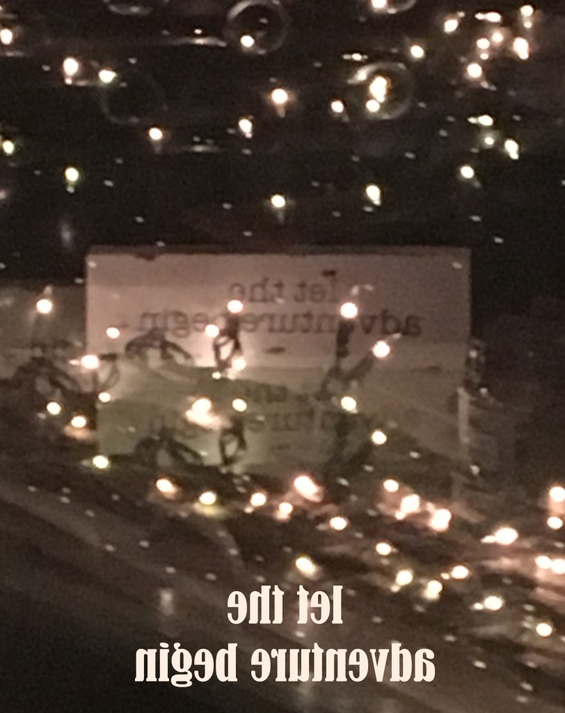 we sat at the table in our sunroom, happy lights on, gazing into the inky blackness of the backyard. it was still rather early in the evening but, these days, dark happens early. it suddenly caught my eye and it made me laugh. the backwards “let the adventure begin” seemed just about right, right about now.