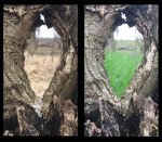 were i to stay in front of this tree and look through the knot-hole in its trunk and only see waning lifeless brown, dried late-fall, believing that my little view was static, i would miss the blink of an eye in which this knot-hole lens turns the scene into rich verdant green, hope-filled.