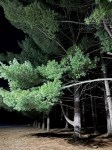 the woods – away from any candlelit trail – were dark. but it was a starlit night and so the shadowy figures of trees and underbrush were more clearly trees and underbrush, rather than the dark figures of scary stuff we might have imagined. in this one spot, artificial light from lightposts lit the pines, illuminating the bow of the branches up close. beyond those lit boughs, a darker woods.