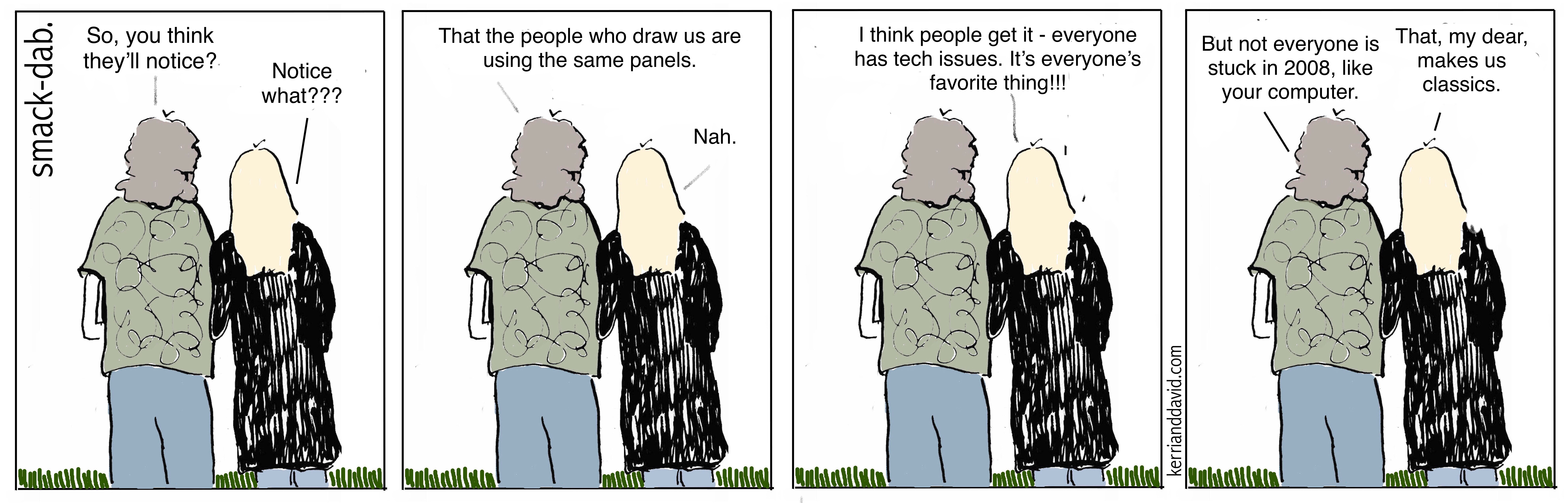 PLEASE NOTE: my 2008 macbook pro has crashed so i have zero access to the tools i usually use to produce SMACK-DAB. please bear with us as i attempt to continue this cartoon with workarounds while sorting out having to invest in new technology. xoxo
