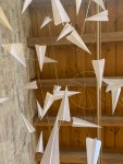i searched in the hall closet – an utter melange of stuff: games, crafts, 10×10 vendor tent weights, playing cards – and found what i was looking for: the last vestiges of the origami airplane folding kit. because their dad was a pilot, this paper airplane kit was a big hit with our children. but i remembered there were a few pieces of origami paper left and – more importantly – the directions on how to fold. mayyyybe d and i will channel the mobile-making juju of groundbreaking mobile sculptor alexander calder … or, at the very least, channel broadway paper.