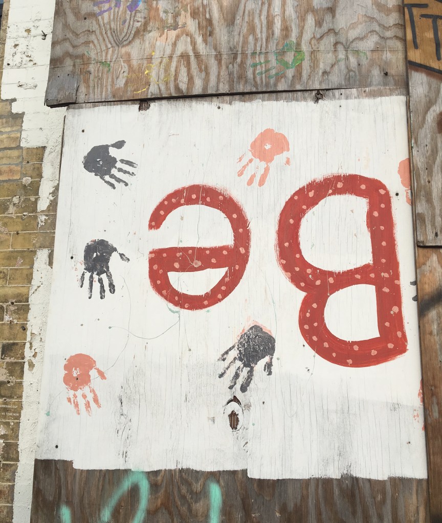 this board was installed and painted on a shop window downtown two years ago now, after the riots in our town, a place reeling with grief and questions and fear. i can still smell the smoke in our open-windowed house, still hear the shots and the sirens, still remember the visceral images. most of the boards are down, but this has been there ever since.