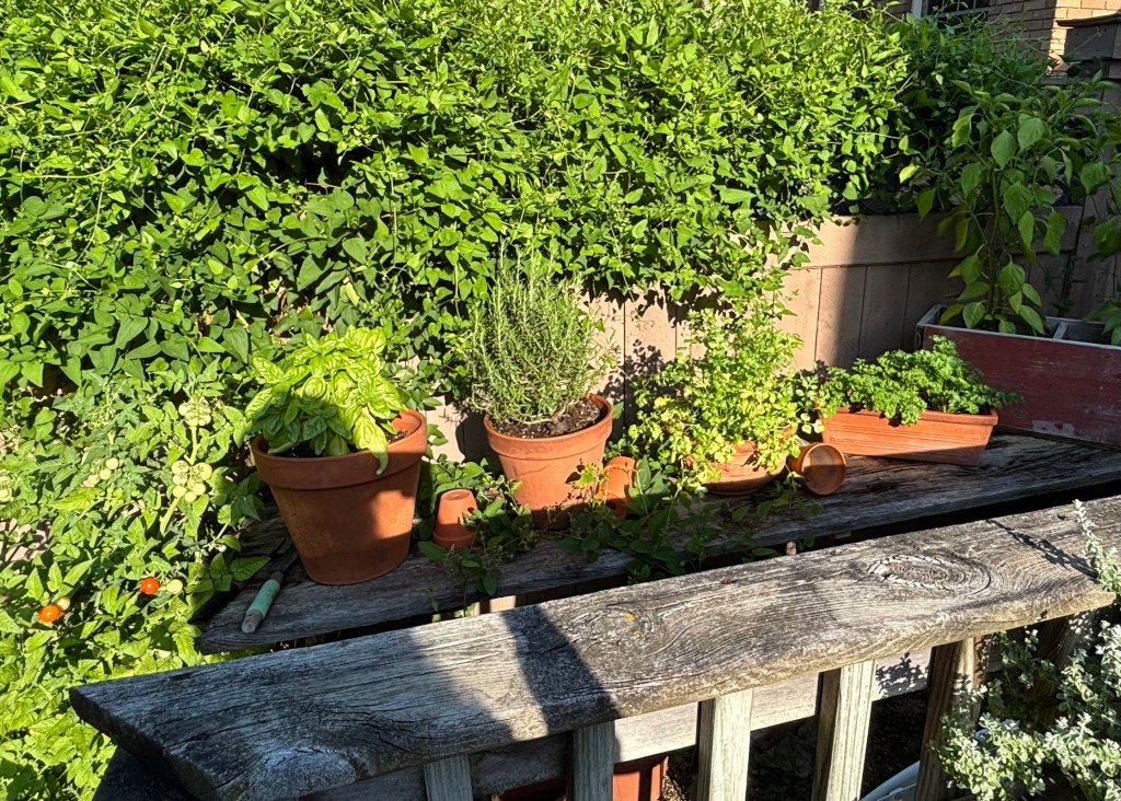 the parsley and the basil are still producing – they graced our homemade tomato soup last night. there are a few jalapeños left, still growing. the dill has dulled; the mint has faded. the cilantro has bolted time and again, despite my best efforts to convince it otherwise. the cherry tomatoes are ripening on the vine and the rosemary is a small tree. i suspect the rosemary will make its way inside for the winter. it all makes me think of next year’s planting – adding sweet potatoes in planters, more tomatoes, maybe a few other vegetables. it’s all been a lesson in embracing something new. it is a tiny space of zen.