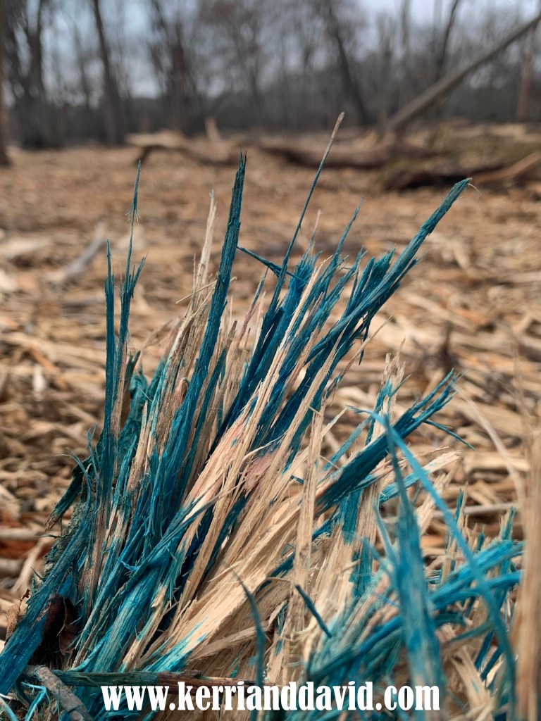 it looks like the hubbabubba fairy flew through, magic wand in hand, touching stumps and shredded trees everywhere. it is striking to see and not just a little disturbing. there is blue-fairy-dust-smattering all over the woods. trees have been felled, underbrush torn up, everything ground into rough-hewn mulch. one shade of blue and many shades of brown.