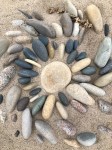 there were several sites of rock art on our special beach. i found this gathering of rocks particularly beautiful. at first i thought it was a spiral, but it seems more a depiction of a tiny galaxy, a planetary system. coming upon these recently-constructed manmade mini petroforms: the mini galaxy, a black and white pinwheel of rocks, a series of rocks simply planted standing in the sand, we know that someone took the time to align these, to say “i’ve been here”, to leave something behind. we were a few of the fortunate ones who saw their work. it’s likely someone will shuffle along the sand and, tempted by the patterns, rearrange the rocks, undoing these designs.